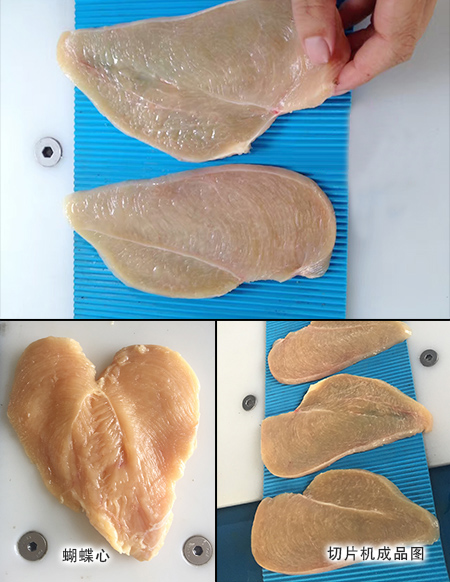 切片機(jī)是對(duì)鮮肉的橫向(水平)整肉一次性多片切割,或?qū)⒄麄€(gè)雞胸肉片切成心形,主要加工:里脊肉片、愛(ài)心雞排、手撕雞排、鴨胸片、勁爆雞排、咖喱肉串,還可與切條機(jī)對(duì)接使用,完成雞肉絲、雞柳條、排條等產(chǎn)品。